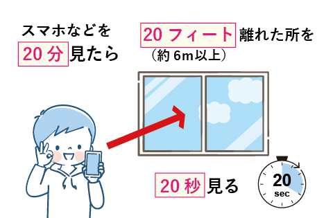 また、アメリカでは「20分近くをみたら→20フィート(6m以上)遠くを→20秒見よう」という「20ー20ー20」ルールを推奨しています。