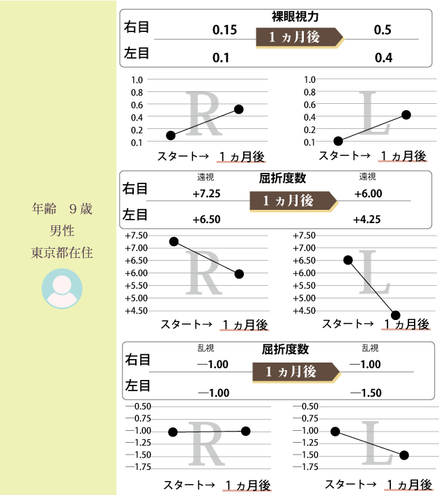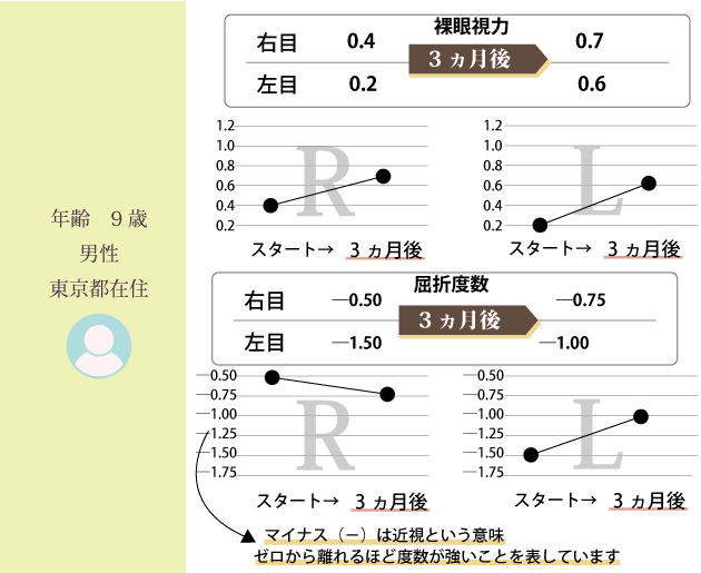 子どもの視力低下は進行が早く、1.0ある視力も一年で0.5まで下がる事もあります。視力が改善してきたのは、これまでの生活習慣を見直して、家族で取り組んでいる成果だと思います。この調子で、是非、メガネの必要のない生活を送って頂きたいと思います。
