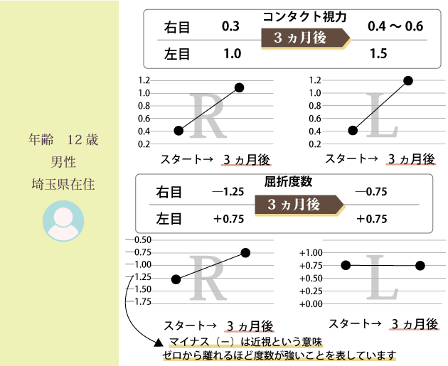 右目が近視、左目が遠視とのことで混乱しましたが、スタッフの方から「もとは右目も遠視だったけど、右目だけで物を見る癖がついてしまい右目だけが近視になったのでしょう」とご説明いただきました。目の動きを見せてもらっても、寄り目をしようとすると右目しか寄っていないのでよくわかりました。目のトレーニングをしっかりして、勉強以外の時間ではできるだけ目に負担をかけないようルールを設けて取り組ませました。(ゲームや動画を見る時間を決めるなど。)これからも続けていきたいです。