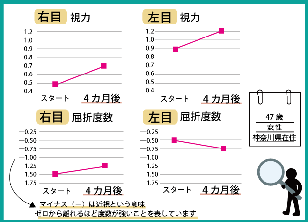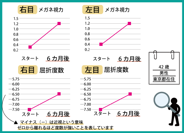 優秀賞おめでとうございます。強度近視の方は、40代くらいになると低下してしまった視力を戻すのが難しくなってきますが、スマホを見る時間を減らしたり、お風呂での目の体操を毎日行うということの相乗効果で、メガネ視力が劇的に改善されました!ご本人の努力の結果が数値に出ましたね。まだまだ改善できると思いますので、これからも普段の生活の中で視力回復ケアに取り組んでいってください。